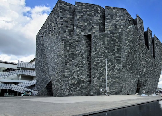 隈研吾氏といえば、自然と共存する木を使った建築デザインが多い印象でしたが、こちらの建築は、まるで巨大な石が落ちてきて、そこに突き刺さっているようなイメージで、迫力があります。